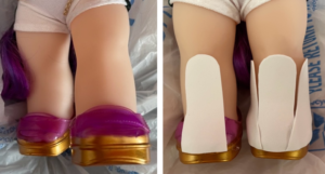 Hot glue the Side Boot pieces (align where the heel goes up on the side) with the PVC hidden to the inside, overlapping the tongue and on the back leg.