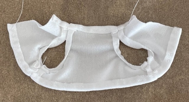 After printing & cutting out the paper patterns, cut the shorts pattern twice out of the white spandex for the front & back. Sew the sides together and sew the bottom edges in with white thread. Place a piece of the 5/8” black ribbon over each side seam and sew with black thread, turning it under the bottom of the edge. Cut out the waistband and sew to the top of the shorts with white thread. Fold it over and sew again. Sew on a piece of black cord over the waistband seam.