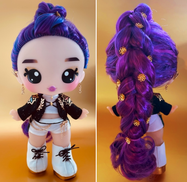 My daughter received a very cute purple-haired doll for her K-Pop birthday party, I assume because Rumi has purple hair. It’s Greta Grape, a Yummiland doll that comes with a make-your-own lipgloss kit. I decided to surprise her by giving it a Golden Rumi makeover!