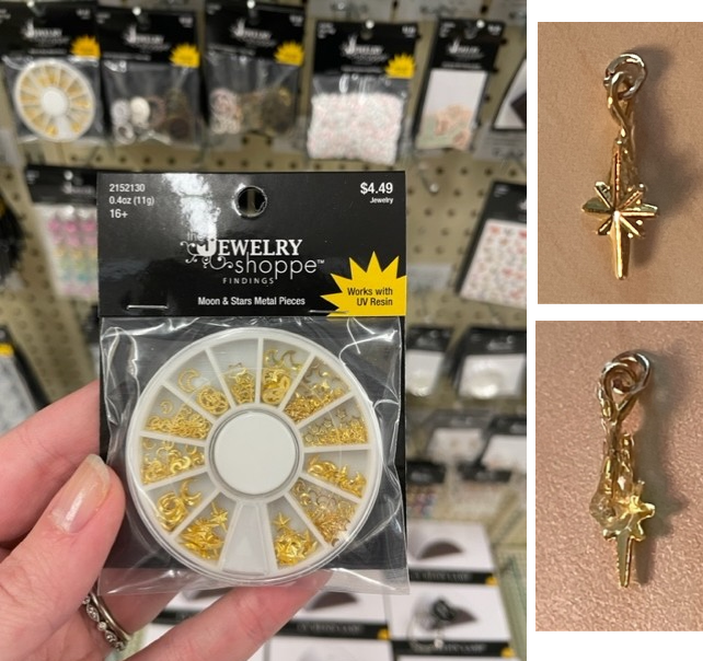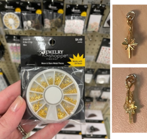 Sew a tiny jump ring to the top of the collar and hang a gold diamond/star shape from it. Mine wasn’t a bead so I turned it into one by hot gluing a gold post with a loop to the back side.