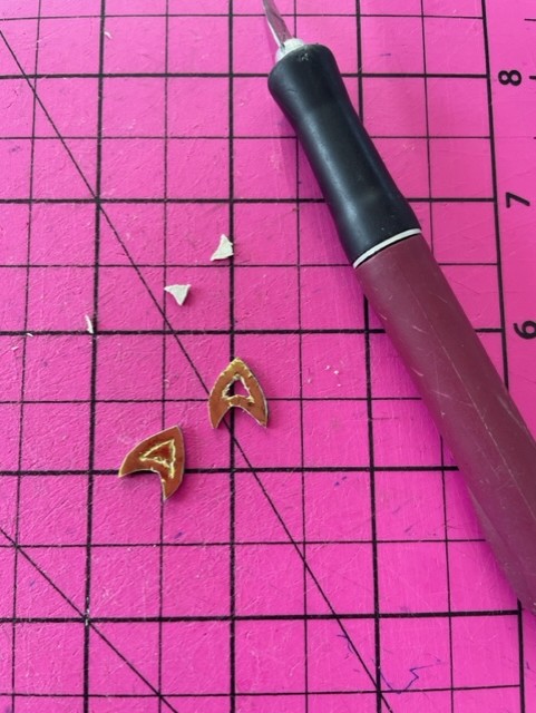 For the upper earring, cut the pattern out of gold card stock 4 times and glue back-to-back with Tacky Glue so you have 2 pieces. Using the Xacto knife with a cutting mat, carefully cut a tiny triangle out of the middles. With a toothpick, paint the white paper edges with metallic gold nail polish. Hot glue both pieces on top of the doll’s ear.