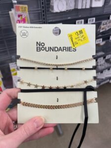 Take a 2 1/8” tiny chain and a 2 5/8” chain (or a 4 3/4” piece turned at 2 1/8”) and sew them at the ends with white thread to the shorts letting them drape down. I found my chains on a pair of earrings that was on clearance at Walmart.