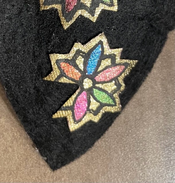 Shoulder Flowers: This is probably the most difficult part. Trace the shoulder flower pattern onto the gold fabric twice (I used parts of an old Halloween unicorn costume from Target) but don’t cut it out yet! Using a toothpick with the black paint, paint the small center circle, then the petals, then the lines between the petals. Once dry, color the petals with different colored permanent markers (if you don’t have that, maybe try nail polish). The colors may soak through the fabric, so color on top of a piece of paper.