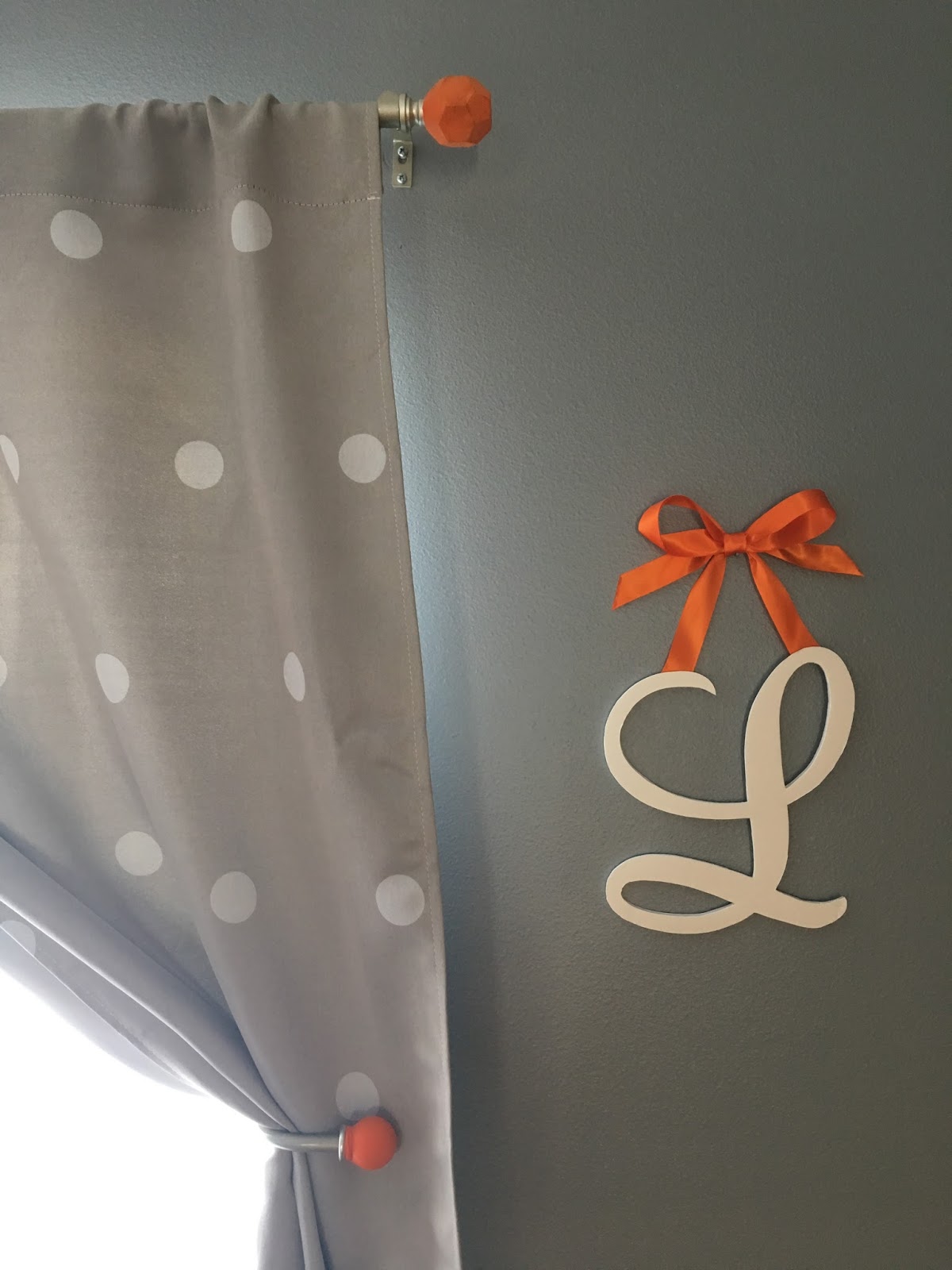 I made the curtain rod and pullback ends orange by stretching balloons over them (I got the idea from an ornament craft on Pinterest), dyed an old lamp shade…